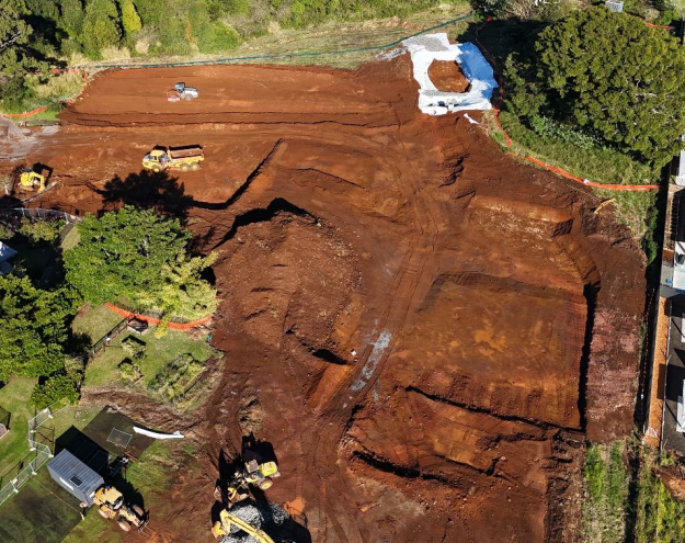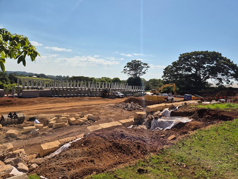 This month, filling and compaction continues across the site, ensuring the ground is stable and ready for future construction, and work has commenced on boulder retaining walls, including excavation and footing preparation for a strong and secure base. Pit excavation is also progressing in readiness for the arrival of the large stormwater detention tank which will form a key part of the site’s long-term drainage and water management system.